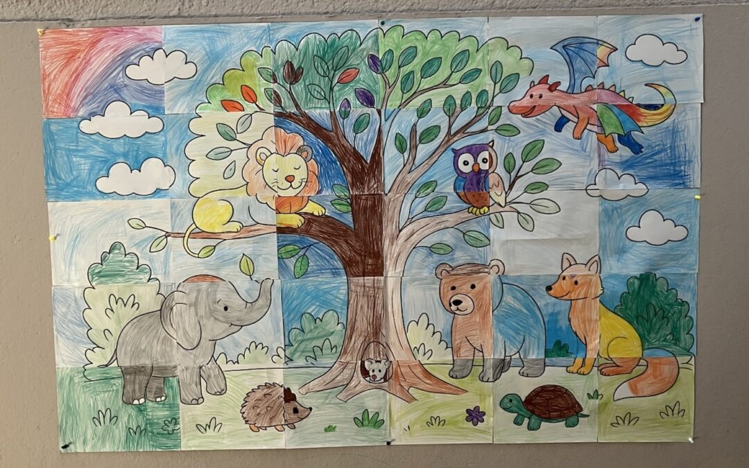 „Huch, der Elefant hat ja eine braune Mütze auf!“, „Oh, der Bär ist ganz blau!“ Diese und noch viele weitere spannende Entdeckungen machten die Kinder der Lindenschule, nachdem ihr Gemeinschaftsbild fertig war. Tatkräftig hatten sie zuvor die einzelnen Bilder ausgemalt, alles zusammengepuzzelt und geklebt. Entstanden war das Bild im Rahmen des Angebots Pause auf der Ruheinsel, welches regelmäßig von unserem Schulseelsorgeteam durchgeführt wird. Das Bild, auf dem alle Klassentiere ihren Platz gefunden haben, soll ein Zeichen des Zusammenhalts an unserer Schule darstellen und kann im A-Gebäude bewundert werden.