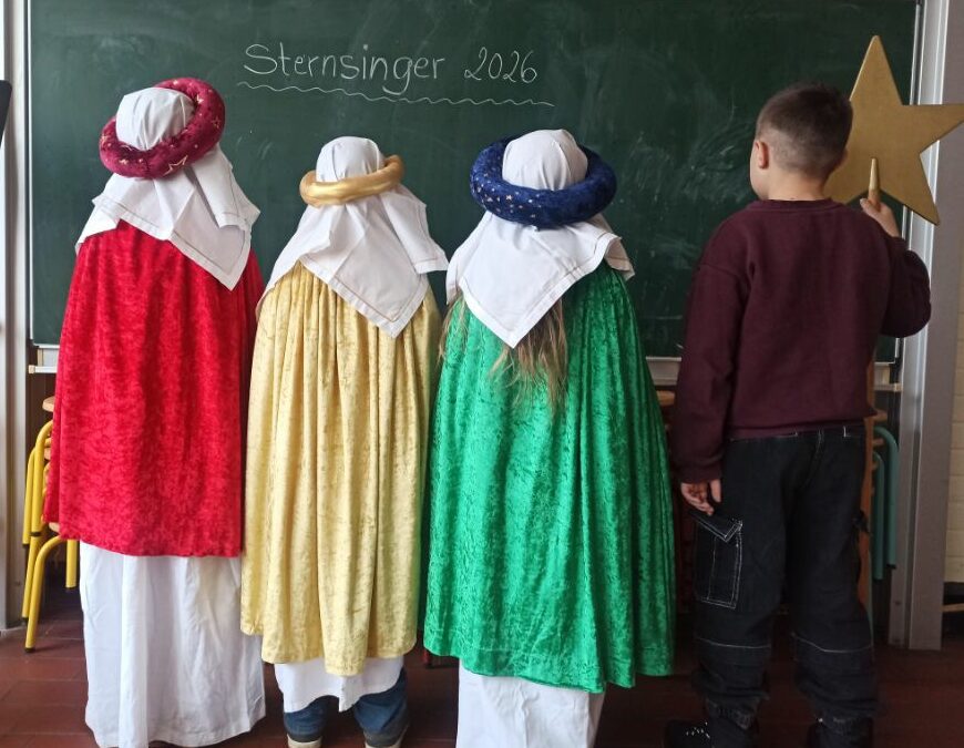 Neun Klassen, den Hausmeister und die Schulsekretärin besuchten sie und überbrachten musikalisch und mit einem Gedicht Gottes Segen und gute Wünsche für 2026. Dank dem tollen Einsatz der „Engel“ und ihrem Durchhaltevermögen prangt jetzt an allen Klassenzimmertüren der Sternsingersegen: 20* C+M+B *26!
