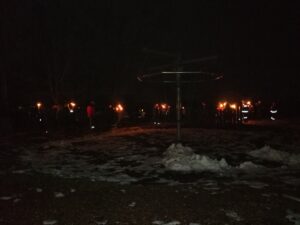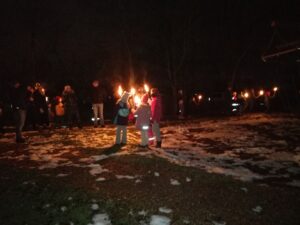 Als schließlich alle Fackeln angezündet waren, setzte sich unsere leuchtende Gruppe in Bewegung. Der Weg wurde von vielen kleinen Flammen erhellt und es sah fast so aus, als würde eine kleine Lichterparade durch die Dunkelheit ziehen. Unterwegs konnten alle ihre eigenen und die Fackeln der anderen bewundern – ein wirklich besonderer Anblick und ein tolles Erlebnis für Groß und Klein.
