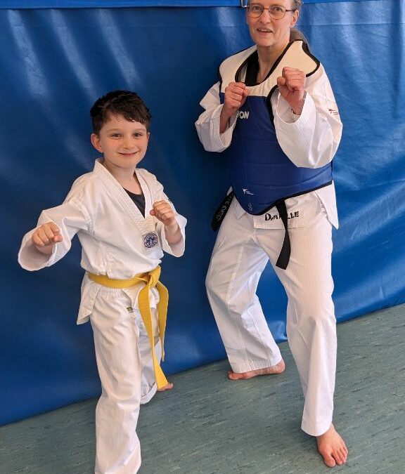 Man trainiert barfuß in einem weißen Anzug und bekommt einen Gürtel in verschiedenen Farben. Wir waren gespannt und wollten gleich loslegen. Aber zuerst mussten wir uns gut aufwärmen wie bei jedem Sport. Dann durften wir gegen eine sogenannte „Pratze“ mit dem Fuß kicken. Das hat Spaß gemacht, war aber auch ganz schön anstrengend. Ganz toll fanden wir auch das Fangspiel mit der Pratze. Wer abgeschlagen wurde, musste drei Liegestützen machen. Dann durfte man wieder mitmachen.